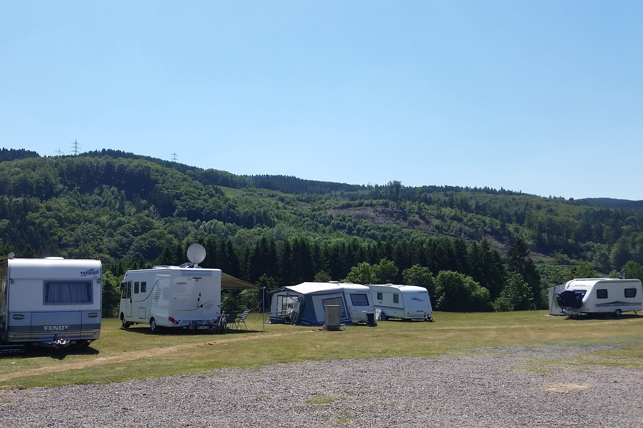 Grote camping. Toeristenplaatsen hoog op een plateau boven de vaste plaatsen gelegen, omringd door boomwallen. Gastvrije camping met gratis leenauto voor campergasten.