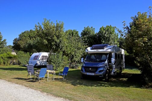Gezellige camping, gelegen op de kliffen. Er is veel ruimte. 500 meter van het strand met zwemmogelijkheid.